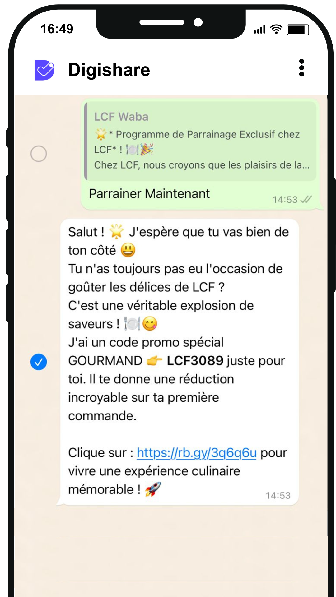 - Un message préenregistré incluant un code promo et un lien est automatiquement généré.